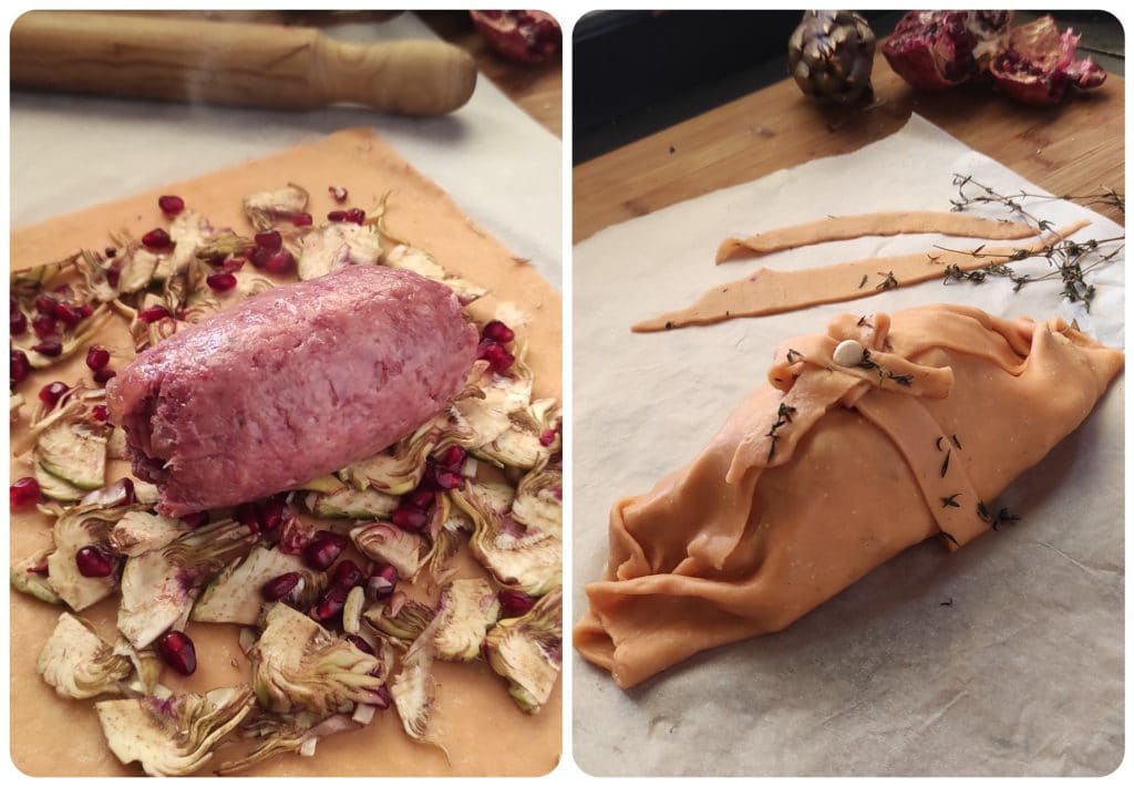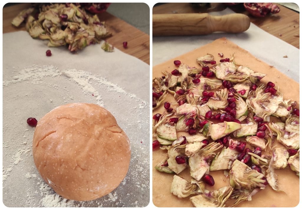 • Nachdem wir die verrückte Pasta zubereitet haben, rollen wir sie auf einem Stück Backpapier aus und formen ein Rechteck der richtigen Größe, indem wir die Ränder ausgleichen (bewahren wir die Reste auf, sie werden für die endgültige Dekoration benötigt). Den Teig dünn, aber nicht zu dünn ausrollen, um ein Reißen beim Backen zu vermeiden. Dann legen wir die dünn geschnittenen Artischocken und die Granatapfelkerne auf, wobei wir die Ränder des Rechtecks freilassen, um es gut versiegeln zu können.