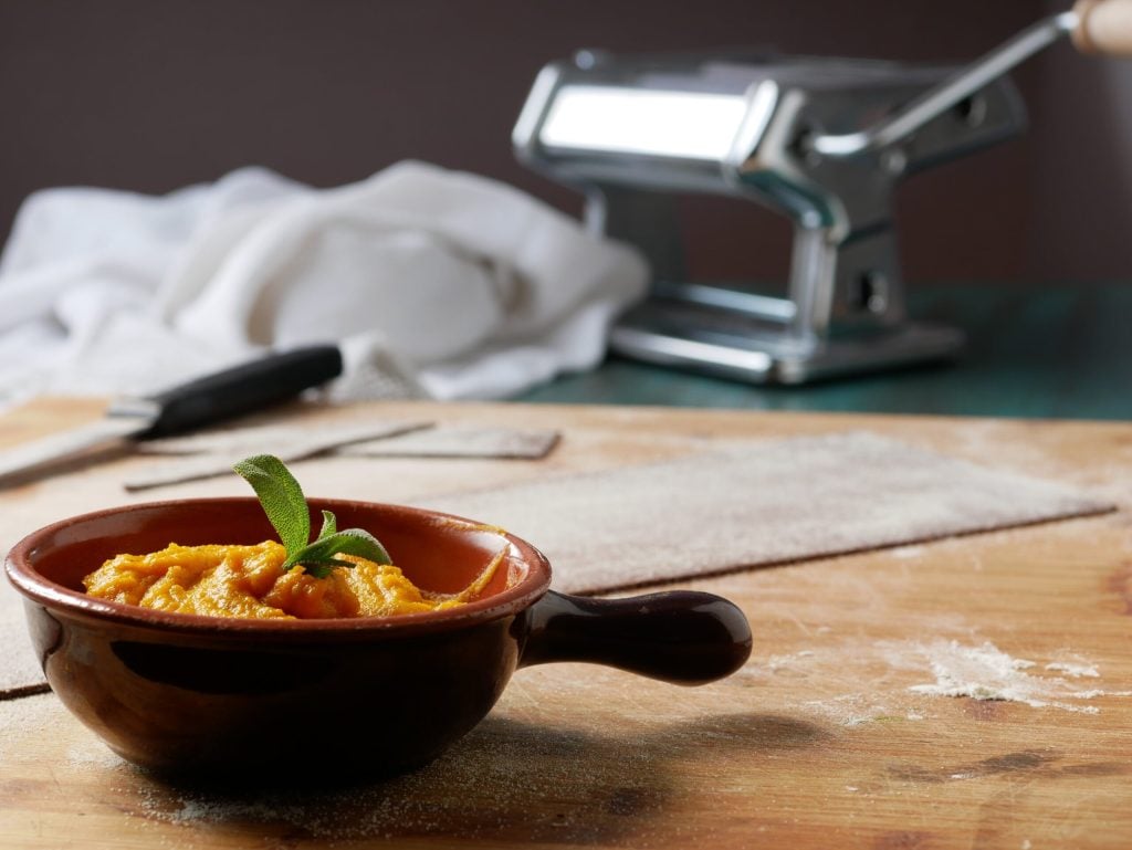 Um die Kakaotagliatelle mit Kürbiscreme zuzubereiten, benötigst du einen Stabmixer und eine Küchenmaschine. Während du auf die Küchenmaschine verzichten kannst, indem du die Tagliatelle von Hand knetest, kannst du nicht auf den Stabmixer verzichten, um den Kürbis cremig und gut gewürzt zu machen. Außerdem brauchst du eine einfache Nudelmaschine, um den Teig auszurollen und zu schneiden, auch wenn du, wenn du möchtest, Walzen, Muskelkraft und ein gutes Messer verwenden könntest. Im Folgenden lasse ich gegebenenfalls Ratschläge für den Kauf getesteter Geräte.