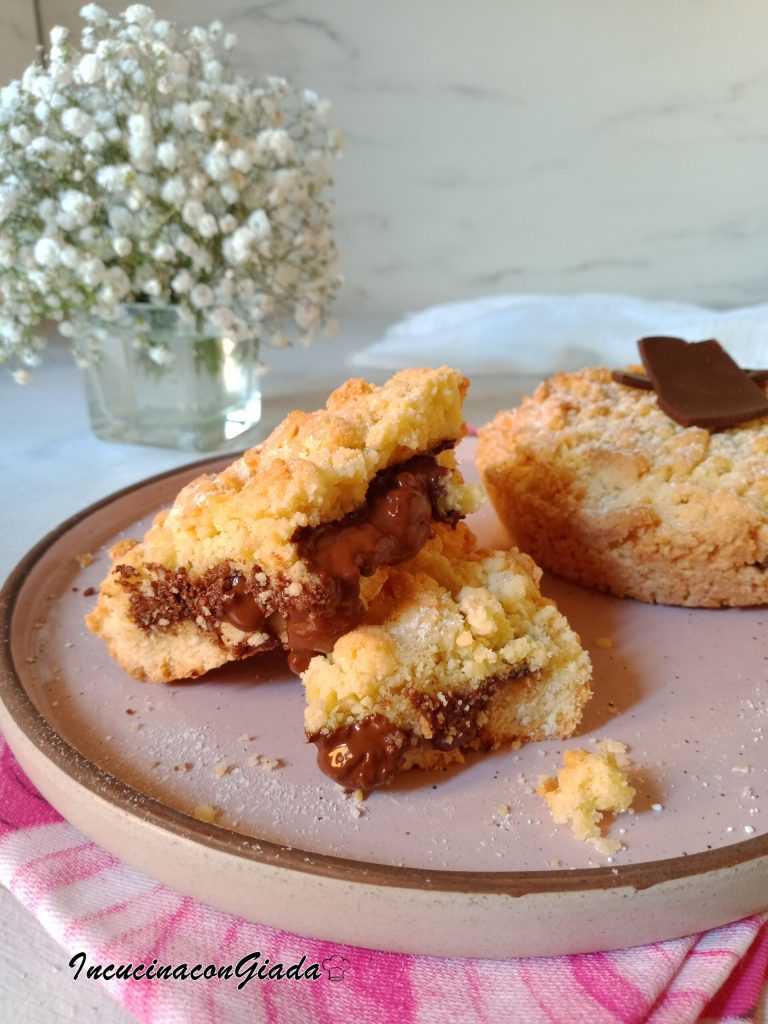 Nach dem Backen haben sie eine weiche Füllung aus Zartbitterschokolade, beim Abkühlen wird die Schokolade fest und es fühlt sich an, als würde man in einen Schokoriegel im Streuselteig beißen 😋