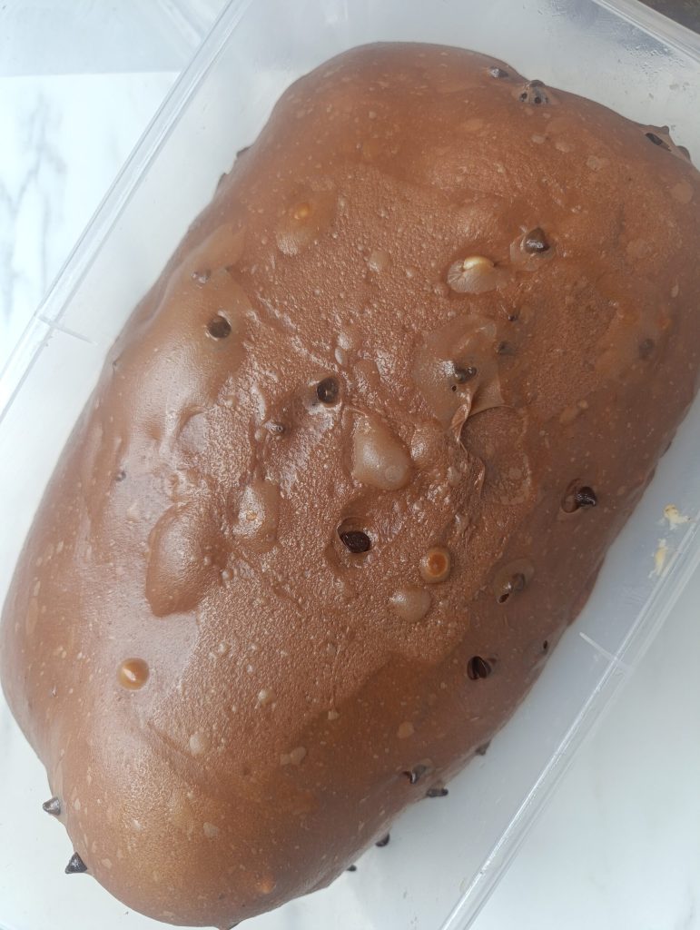 Fetten Sie die Arbeitsfläche mit Butter ein und stürzen den Teig darauf. Mit einer abgedeckten Schüssel etwa 10 Minuten ruhen lassen. Danach mit geölten Händen auf der Arbeitsfläche ausbreiten, die Schokotropfen (bei mir auch etwas weiße Schokolade) einarbeiten und den Teig wie ein Buch zusammenklappen, die Seiten zur Mitte falten. Fügen Sie immer wieder Schokotropfen hinzu, sobald Sie eine freie Fläche sehen 😋. Schließen Sie den Teig langsam gut, drehen Sie die Öffnung nach unten und formen Sie eine Kugel. Legen Sie den Teig zum Gehen in einen luftdichten Behälter an einen warmen Ort, bis er sich verdoppelt. Auch im Ofen mit eingeschalteter kleinen Lampe eignet sich.