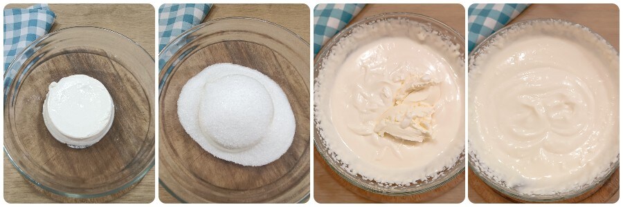 Um die kühlen Kirschdelikatessen zuzubereiten, beginnen Sie damit, die Ricotta in einer Schüssel mit dem elektrischen Mixer zu schlagen, bis sie halb steif ist. Sobald die Ricotta fertig ist, fügen Sie den Mascarpone hinzu und mischen Sie sorgfältig, um alle Zutaten gut zu verbinden.