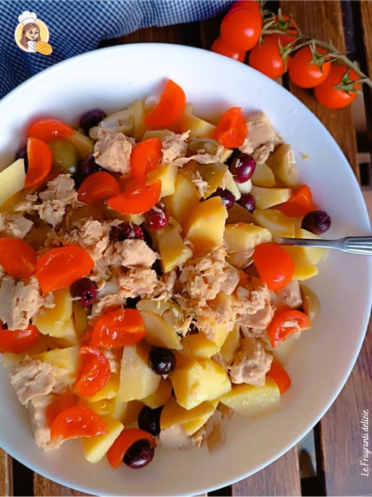 Jetzt schäle die noch warmen Kartoffeln und schneide sie in Würfel oder Spalten, dann gib sie in eine große Schüssel. Füge den Thunfisch, die Kirschtomaten, die Oliven und die in Scheiben geschnittene frische Frühlingszwiebel hinzu. Gib das extra native Olivenöl dazu und würze mit Salz. Zum Schluss vorsichtig mischen, um alle Zutaten zu verbinden. Vor dem Servieren den Salat mit frischem, gehacktem Basilikum für einen zusätzlichen Hauch von Frische bestreuen.