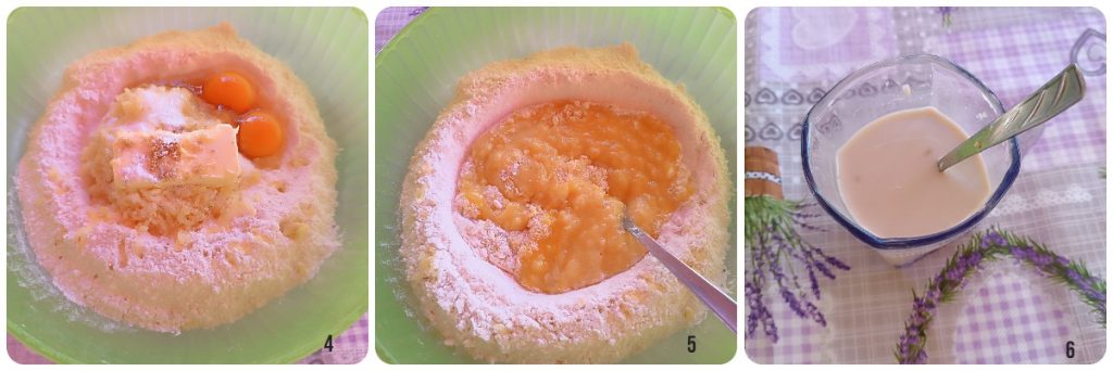 Fügt auch die ganzen Eier, das Salz, die weiche Butter, das Vanillinzucker-Tütchen und die geriebene Zitronenschale hinzu [4]. Beginnt, die Zutaten zu mischen [5], und löst dann die Hefe im Glas Milch [6] gut auf.