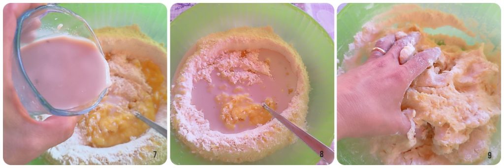 Gießt nun die Hefe in die Mischung [7] und beginnt mit einer Gabel zu kneten und das Mehl einzuarbeiten [8]. Wenn die Mischung eine gewisse Konsistenz erreicht hat, beginnt, den Teig mit den Händen zu bearbeiten [9].