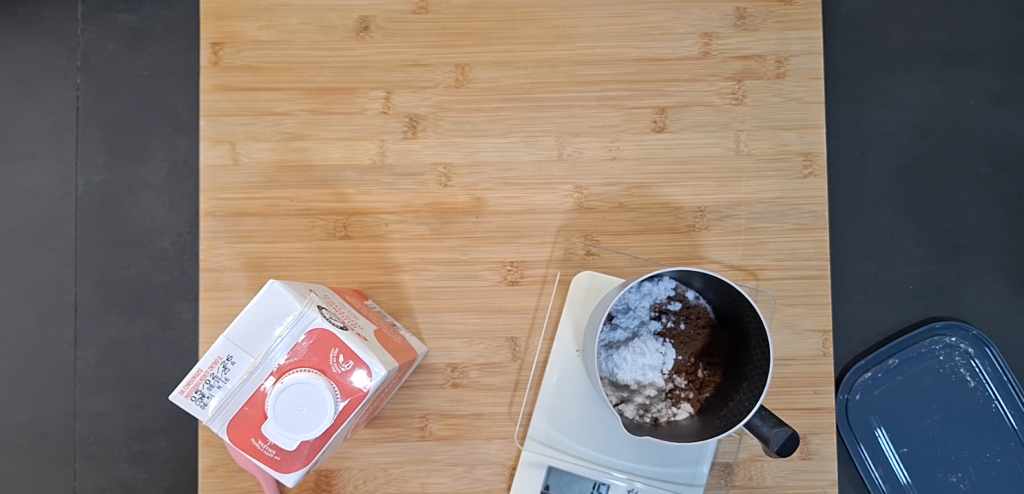 • In einem kleinen Topf die trockenen Zutaten mischen: ungesüßter Kakao, Zucker, Maisstärke und eine Prise Salz (nur wenige Körner).