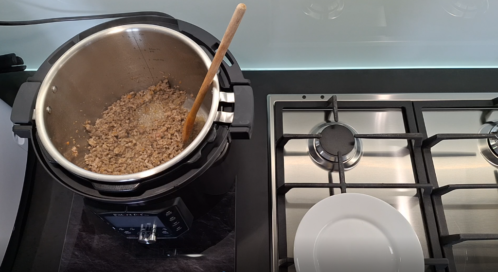 Rühre sorgfältig um und kratze den Boden des Topfes mit einem Holz- oder Silikonlöffel gut ab: Dieser Schritt ist entscheidend, um die BURN-Meldung zu vermeiden.