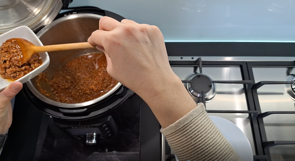 Öffne den Deckel, entferne den Lorbeer und probiere. Wenn das Ragù dir zu flüssig erscheint, aktiviere erneut SAUTÉ und lasse es 3–5 Minuten eindicken, dabei umrühren.