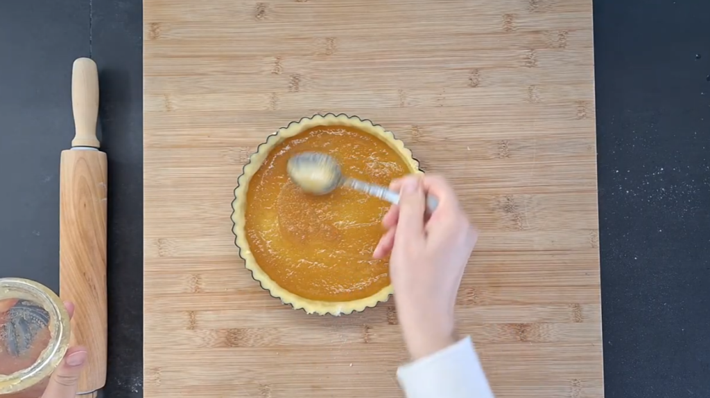Verteile die Apfelmarmelade (oder die Marmelade deiner Wahl) auf dem Boden und glätte sie vorsichtig.