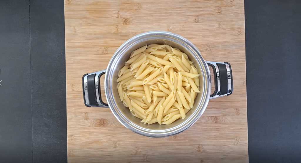Abgießen und sofort unter kaltem Wasser abschrecken oder beiseite stellen, um sie später zur überbackenen Pasta hinzuzufügen.Kochen Sie die Pasta in reichlich gesalzenem Wasser und gießen Sie sie al dente ab. Lassen Sie sie direkt im Topf: So vermeiden Sie das Verschmutzen weiterer Schüsseln und können alles bequem mischen.