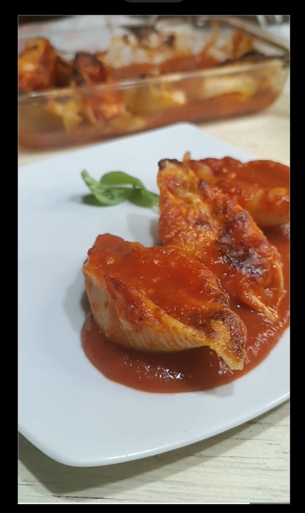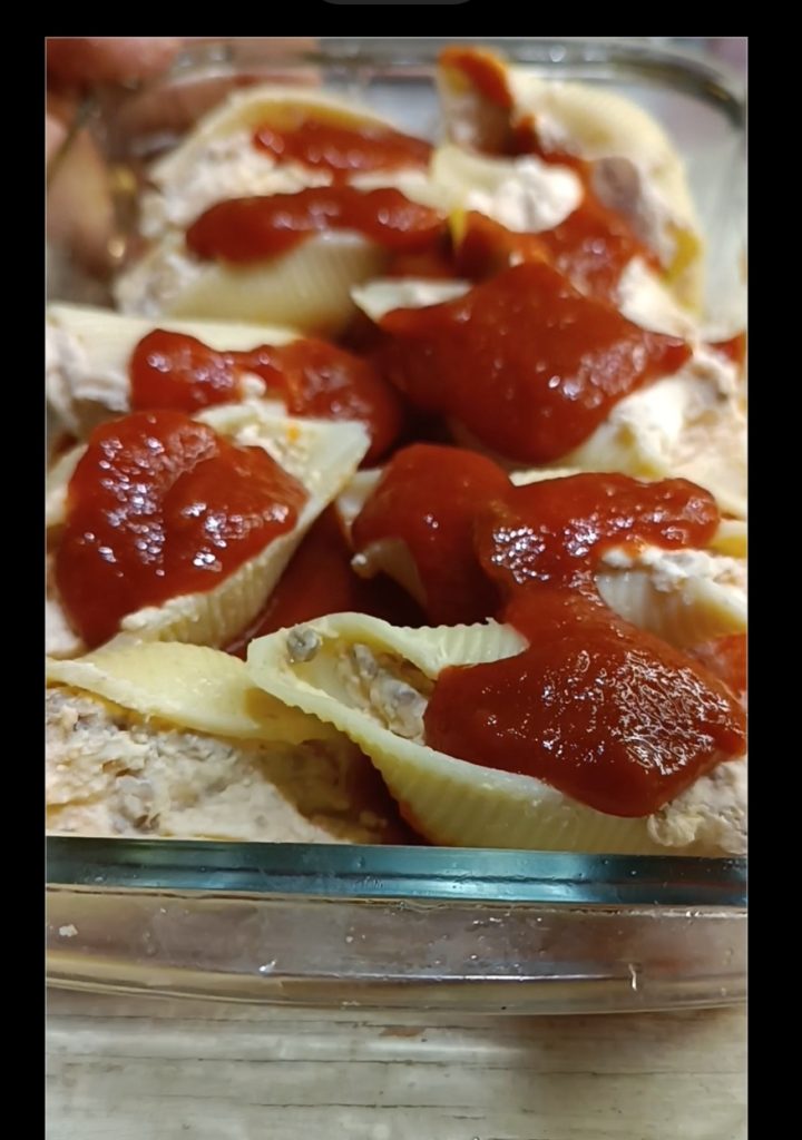 Wir legen die Conchiglioni in eine mit Ragù bedeckte Auflaufform und bedecken sie mit der Sauce. Mit geriebenem Käse bestreuen und im vorgeheizten Ofen etwa 30 Minuten backen.
