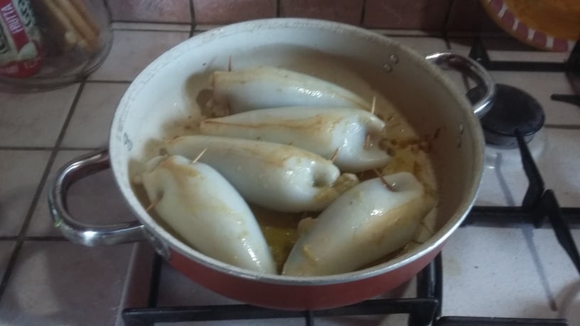 In einer Schüssel die Tentakeln, das Brot, ein Ei, den Käse, die zerkleinerten Oliven und Kapern, die geschnittene Petersilie, bei Bedarf Salz und nach Geschmack in Stücke geschnittene süße Wurst und Pfeffer hinzufügen. Alles gut vermengen und die Tintenfische füllen. Mit einem Zahnstocher verschließen.