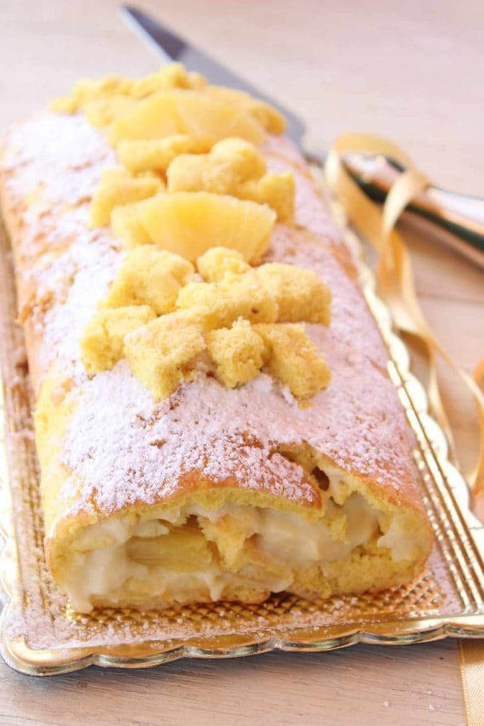 • Lege die Rolle auf ein Tablett, bestäube sie mit Puderzucker und garniere mit den abgeschnittenen Biskuitstücken und Ananas.
