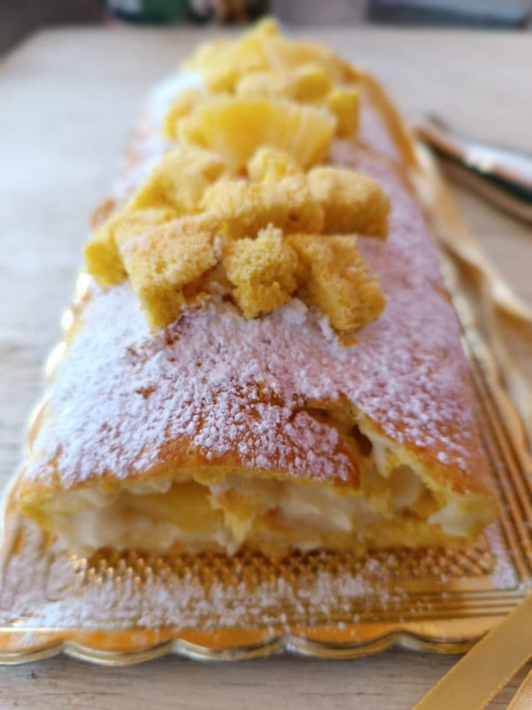• Lege die Rolle auf ein Tablett, bestäube sie mit Puderzucker und garniere mit den abgeschnittenen Biskuitstücken und Ananas.