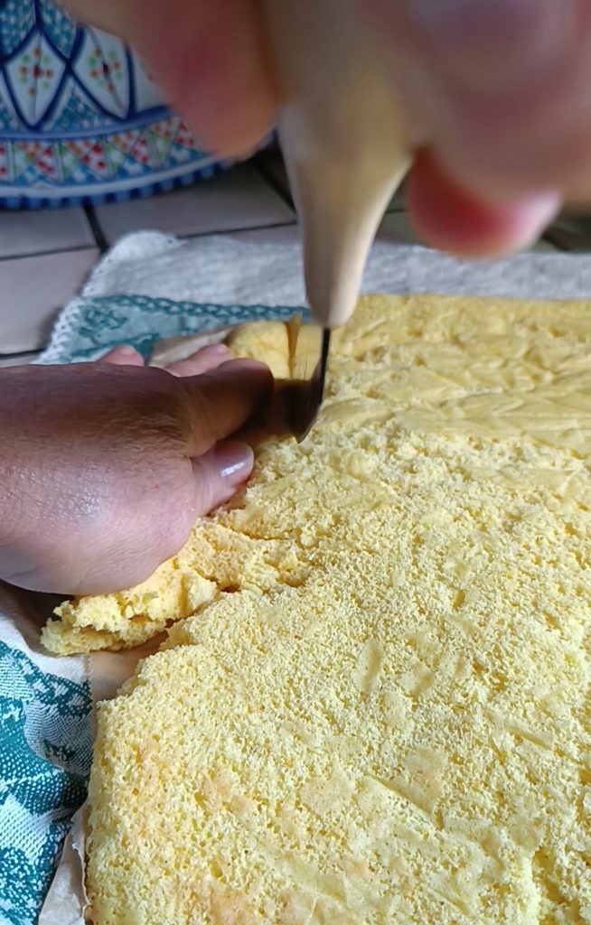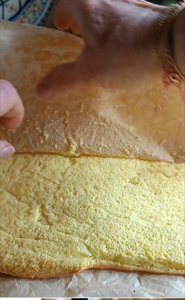 • Drehe den Biskuitteig um und entferne das Backpapier.