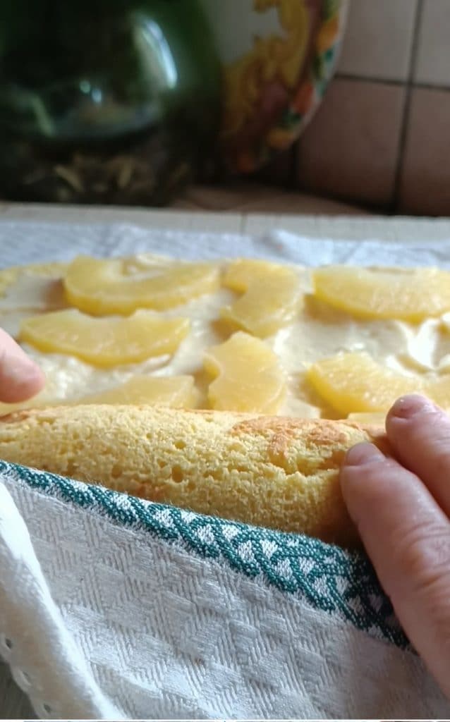 • Rolle den Biskuitteig vorsichtig auseinander. Wenn du möchtest, befeuchte ihn leicht mit dem Ananassaft, verteile die Creme, lege die in Stücke geschnittene Ananas darauf und rolle ihn vorsichtig mit Hilfe des Tuches auf.