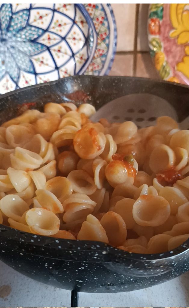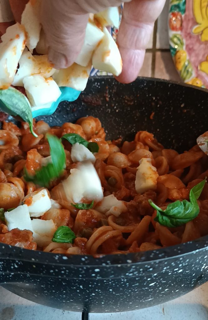 In derselben Pfanne natives Olivenöl extra geben und eine halbe Zwiebel anbräunen. Fügen Sie die Wurst, die Pilze und die Erbsen mit etwas Wasser hinzu. Lassen Sie alles einige Minuten einziehen und fügen Sie die Passata hinzu, würzen Sie mit Salz, fügen Sie ein paar Basilikumblätter hinzu und, wenn Sie möchten, Pfeffer oder Chili. Ca. dreißig Minuten bei schwacher Hitze und mit Deckel kochen lassen.