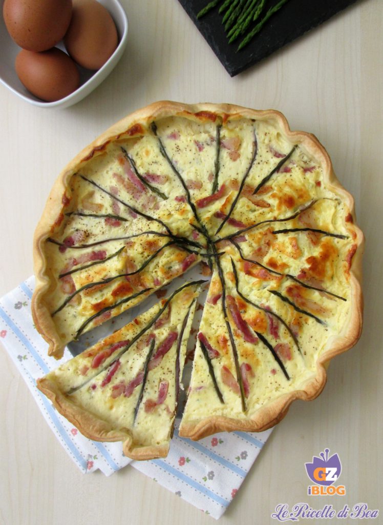 • Das Rezept für den herzhaften Kuchen mit Spargel und geräuchertem Speck erfordert wirklich wenig Vorbereitungszeit, daher beginnen wir mit dem Vorheizen des Ofens auf 180° im statischen Modus. Dann bringen wir etwas Wasser mit einer Prise Salz zum Kochen und tauchen die Spargel für etwa zehn Minuten ein.