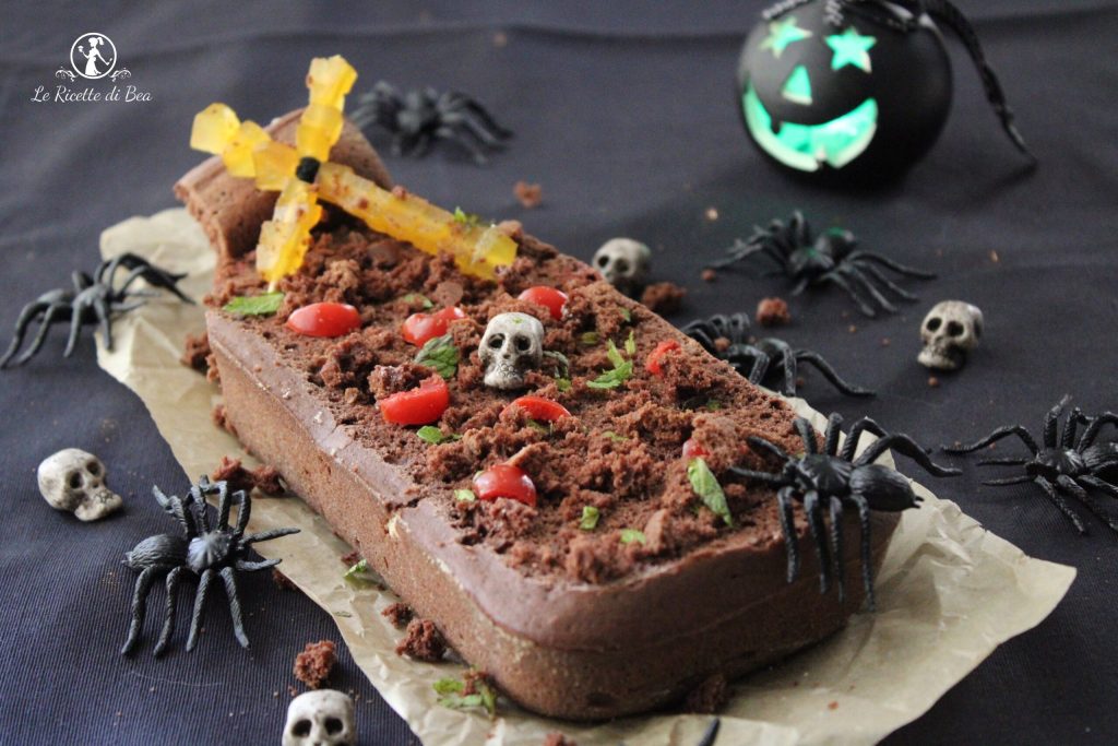 Wir zerbröseln mit den Händen den oberen Teil des Plumcakes, den wir abgeschnitten haben, um den Effekt von Erde auf dem Sarg zu erzielen und unser Halloween-Kuchen ist fertig!