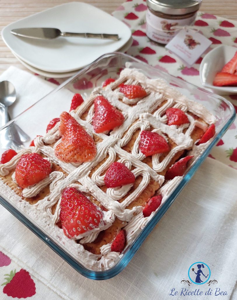 Ich bin ein echter Liebhaber von Tiramisù, deswegen findet ihr auf der Seite auch das Rezept für die Tiramisù-Creme, die super vielseitig ist und für jede Variante geeignet. In diesem Fall wollte ich jedoch auf Eier verzichten, um sie nicht pasteurisieren zu müssen, und ich benutze Oro Saiwa, die ich den klassischen Löffelbiskuits vorziehe. Natürlich hindert euch niemand daran, die klassischen Tiramisù-Kekse für die Zubereitung dieses Erdbeerdesserts zu verwenden.