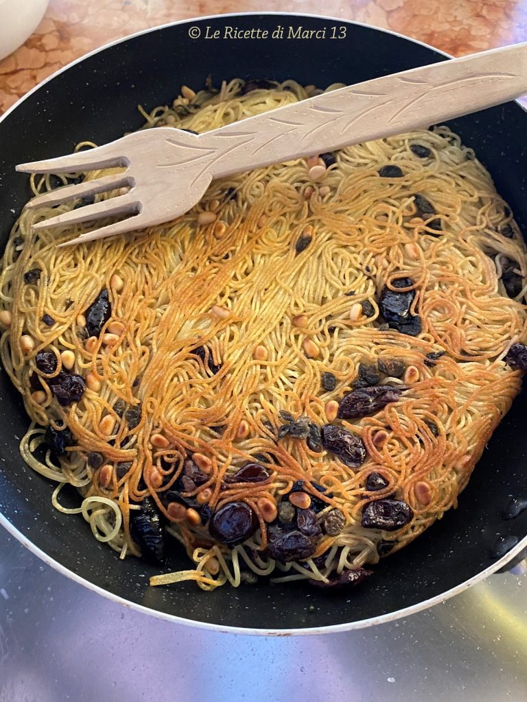 Das einfache Rezept des Nudelomeletts, „einfach“ weil es ein Nudelomelett ohne Eier ist, aber so gut und schmackhaft mit seiner goldenen Kruste und der Mischung aus Oliven und Kapern, dass man es das ganze Jahr über essen kann und auch für Ausflüge an Ostermontag oder ans Meer ideal ist.
