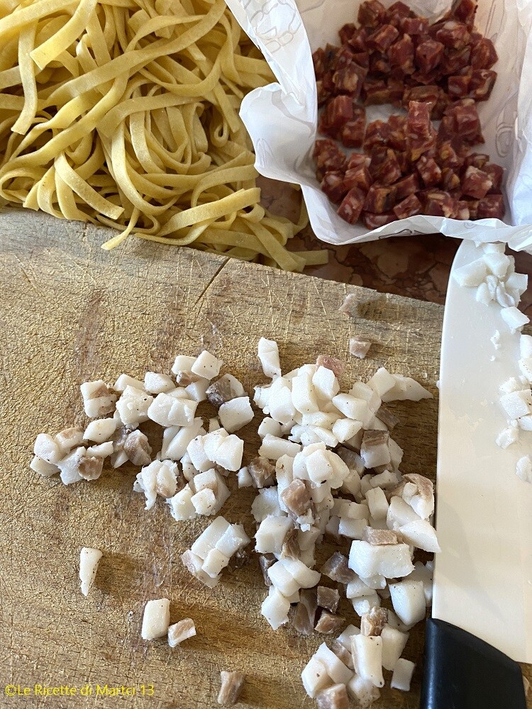 Die Zubereitung dieser rustikalen Tagliolini-Pastiera ist ungewöhnlich: Bevor sie in den Ofen kommt, wird Milch über die gekochte Pasta mit Speck gegossen und gewartet, bis die Milch vollständig absorbiert ist, danach werden die restlichen Wurstwaren und Käse hinzugefügt und im Ofen gebacken.