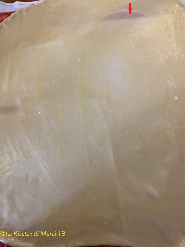 In der Zwischenzeit die 160 g Butter im Wasserbad schmelzen lassen. Nach der Ruhezeit den Teig auf einem bemehlten Küchentuch zu einem Rechteck ausrollen, dann mit dem Handrücken ausziehen, bis er sehr dünn ist, so dass er durchsichtig ist und man das Küchentuch hindurchsehen kann, wie auf dem Foto (siehe rote Pfeil im Foto).