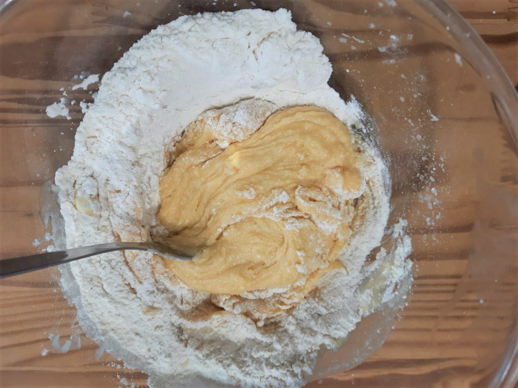 Dann einen Teil der Maisstärke und der Kartoffelstärke hinzufügen und sie langsam mit der Milch vermengen.