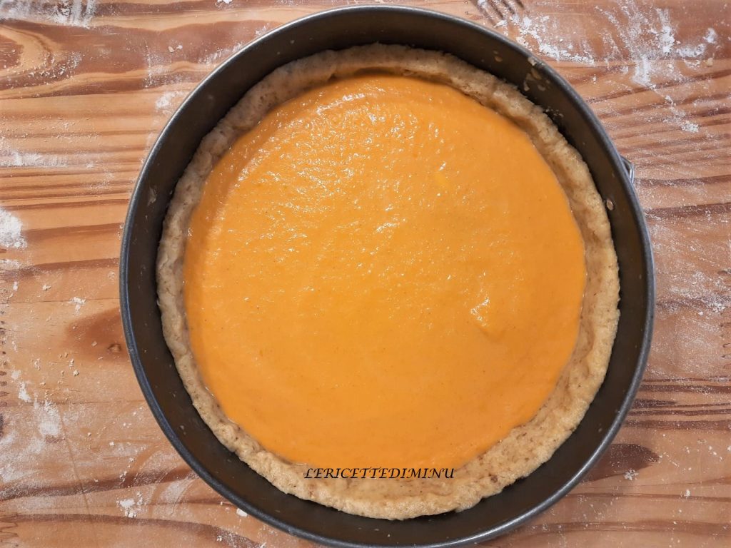 Den Mürbeteigboden mit der Füllung füllen und im vorgeheizten Backofen bei 180 Grad auf mittlerer Ebene, statische Funktion, für etwa 50 Minuten backen.