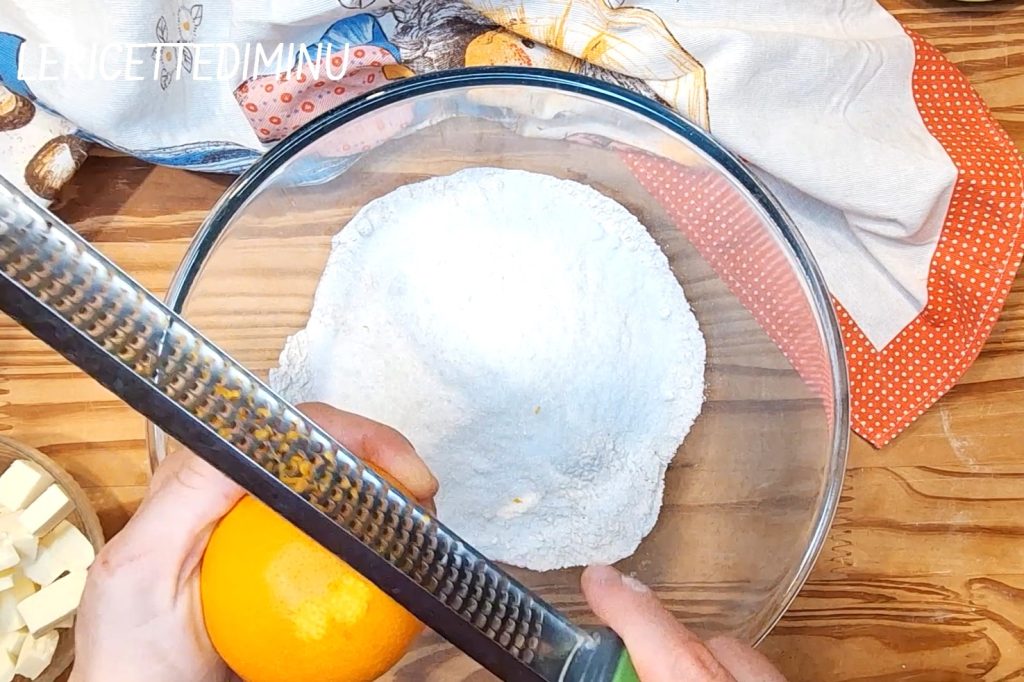 In einer großen Schüssel das Mehl, den Zucker, das Backpulver, eine Prise feines Salz, die geriebene Bio-Orangenschale, das Ei und die kalte Butter in Stücken vermengen.