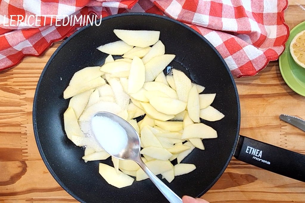 In dünne Scheiben schneiden, in eine antihaftbeschichtete Pfanne mit ein paar Tropfen Zitrone (dem Saft von etwa einem Viertel einer Zitrone) und dem Zucker geben.