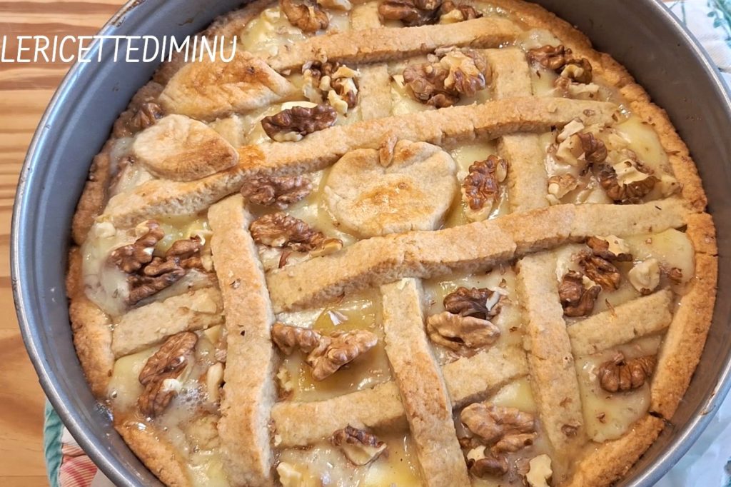 Die Apfeltarte mit Creme und Nüssen ist ein köstliches Dessert, bei dem die Äpfel in einer reichhaltigen Schicht aus Puddingcreme getaucht sind, die von vielen Walnusshälften bedeckt ist, welche nicht nur ihren Geschmack verleihen, sondern dem Dessert auch eine knusprige Note geben.