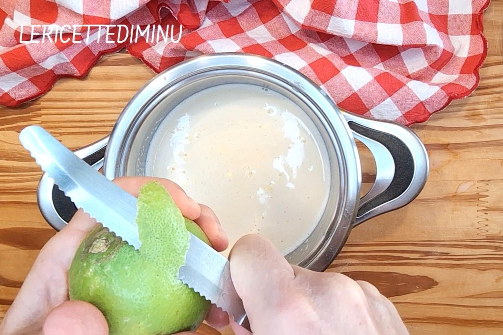 Zuletzt, die in Streifen geschnittene Schale einer unbehandelten Zitrone in den Topf geben.
