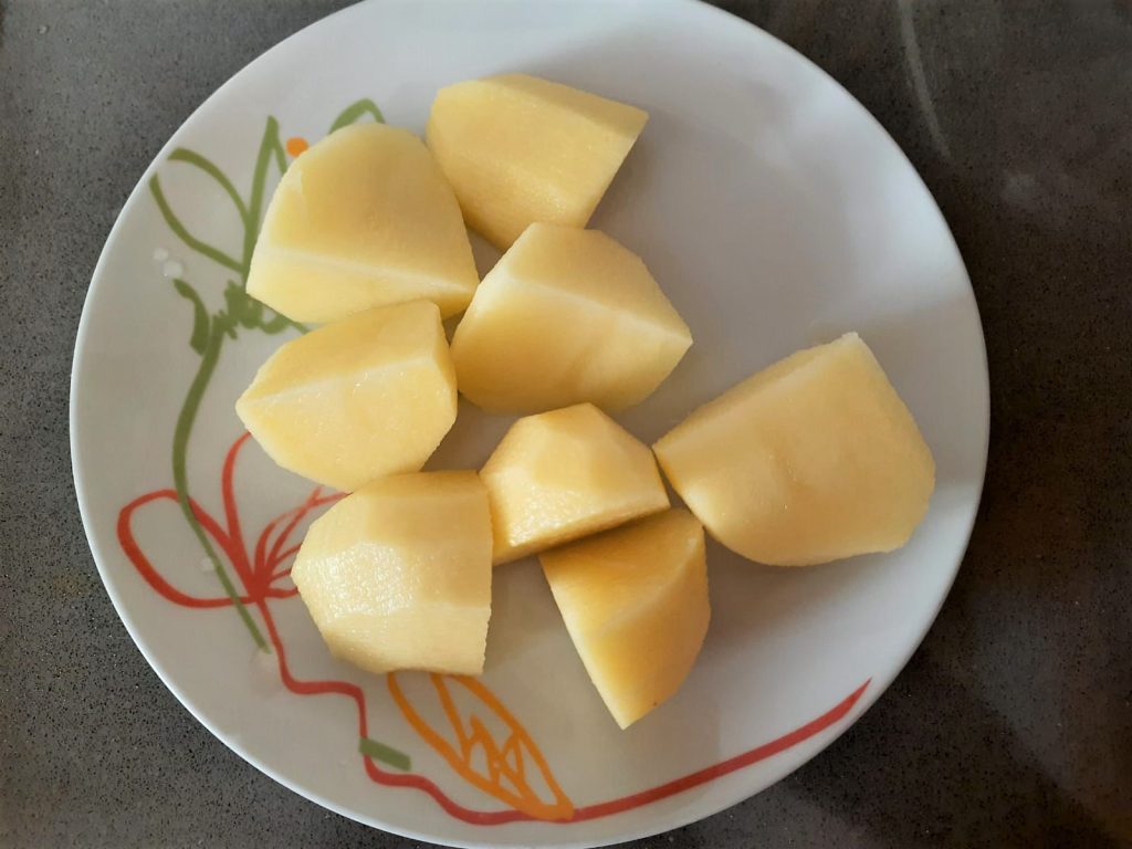 Zum Kochen bringen, dann leicht salzen und die Kartoffeln, in vier Teile geschnitten, hinzufügen. Die Flamme herunterschalten und etwa 20 Minuten halb zugedeckt köcheln lassen.