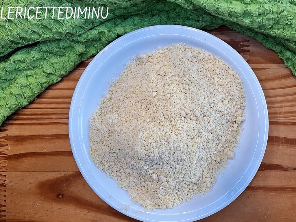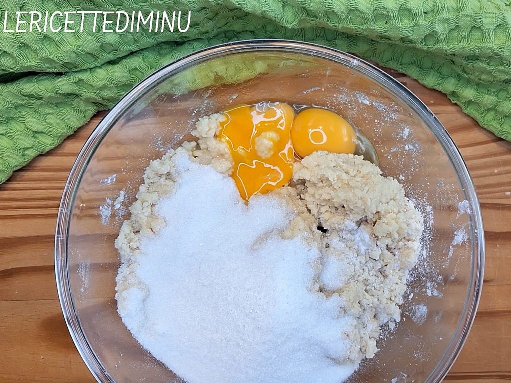 In einer Schüssel das Mehl, die gehackten Mandeln und die in Stücke geschnittene Butter verarbeiten.