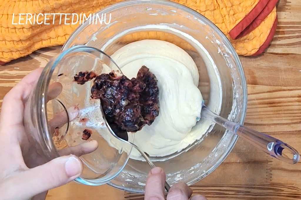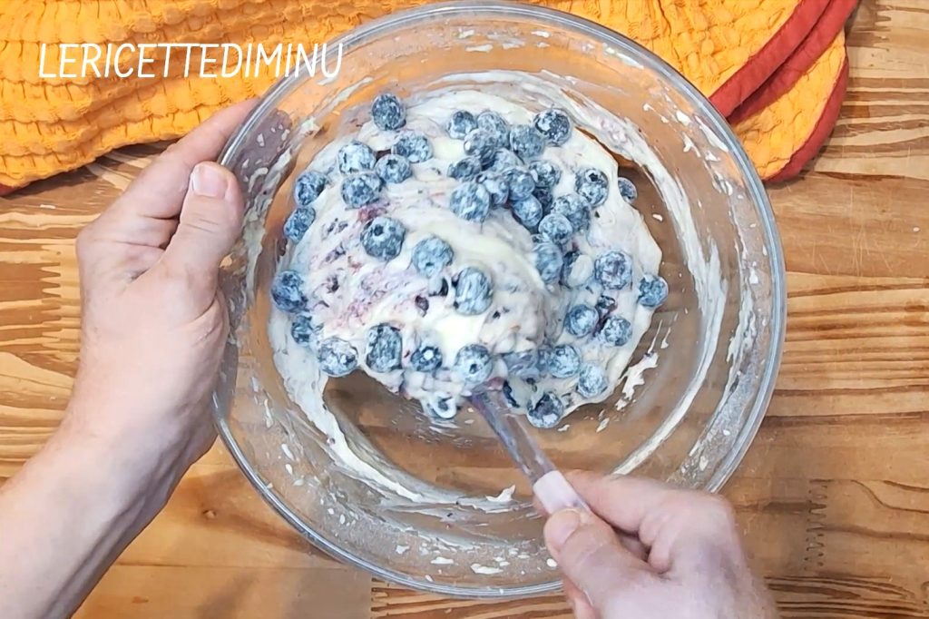 Die pürierten Blaubeeren hinzugeben und mit einem Spatel unterheben. Zum Schluss die restlichen Blaubeeren hinzufügen, vorher gut abklopfen, um überschüssiges Mehl zu entfernen.