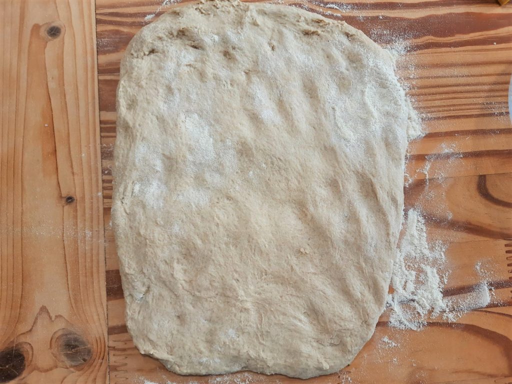 Den erhaltenen Teig zu einer runden Form kneten, leicht mit Mehl bestäuben und in eine Schüssel legen, bei Raumtemperatur mit Folie abgedeckt für 2 Stunden gehen lassen.