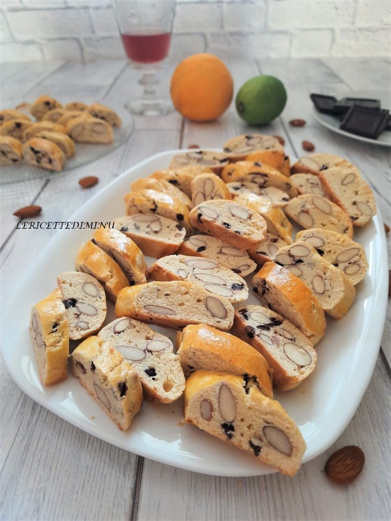 Die Cantucci mit Mandeln und Schokoladenstückchen sind eine Variante der bekannten toskanischen Cantucci, die man getränkt in Vin Santo genießt.