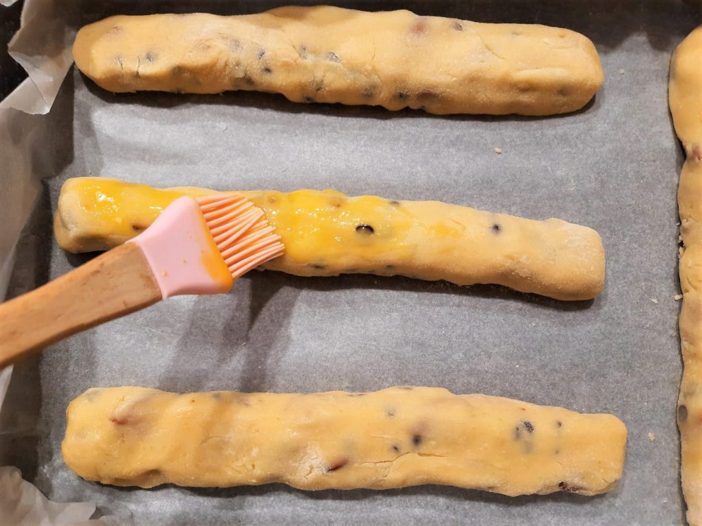 Mit einem Küchenpinsel die Oberflächen der Rollen gleichmäßig mit verquirltem Eigelb, einem Schuss Vanillin und ein paar Tropfen Wasser bestreichen.