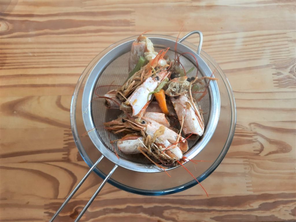 Aus der fertigen Sauce die Garnelen mit dem Kopf herausnehmen und einige Löffel Sauce beiseitelegen.