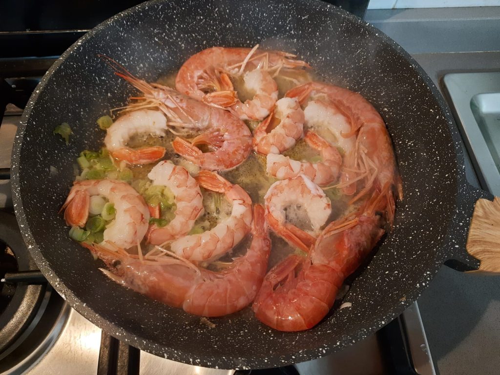 Leicht anbraten und dann die Garnelen mit den anhaftenden Schwänzen und die ganzen Garnelen hinzufügen. Lassen Sie sie würzen und mit Weißwein ablöschen.