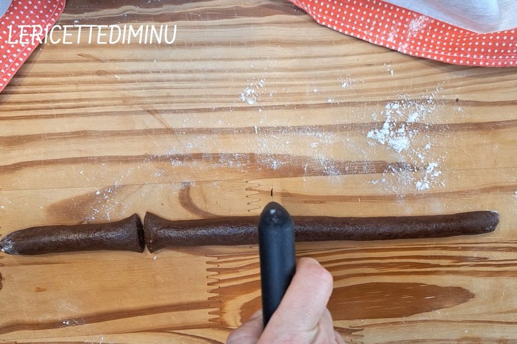 Aus jedem dieser Teile ein langes Stück mit einem Durchmesser von knapp zwei Zentimetern formen. In ca. 10 cm lange Stücke schneiden.