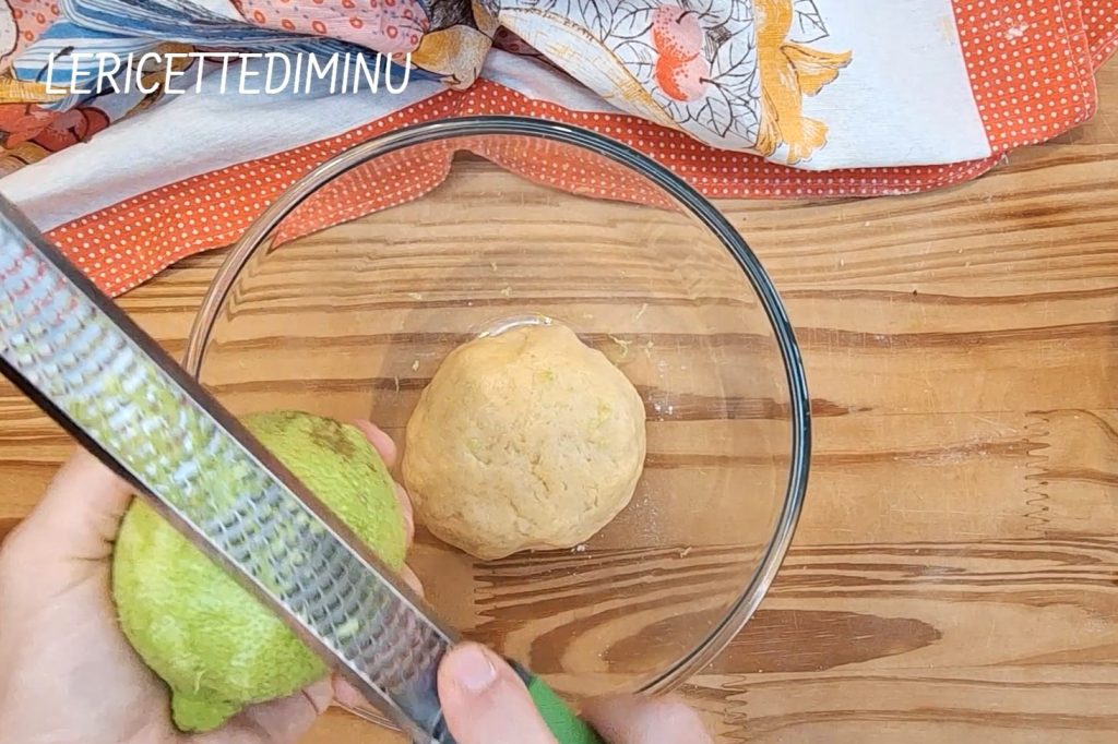 • Eines dieser beiden Stücke mit geriebener Schale einer unbehandelten Zitrone aromatisieren und kneten, um sie zu integrieren.