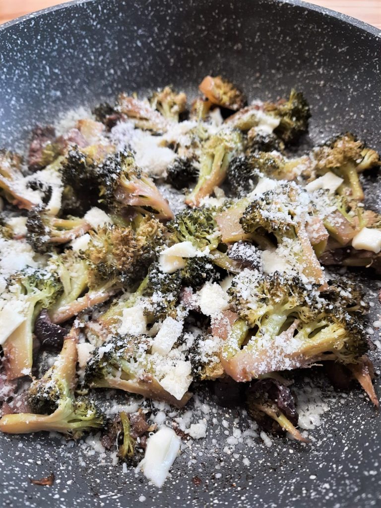 Während die Brokkoli kochen, darauf achten, dass sie nicht zu trocken werden. Dafür ist es wichtig, keine zu große Pfanne zu verwenden, immer den Deckel aufsetzen und die Hitze niedrig halten.