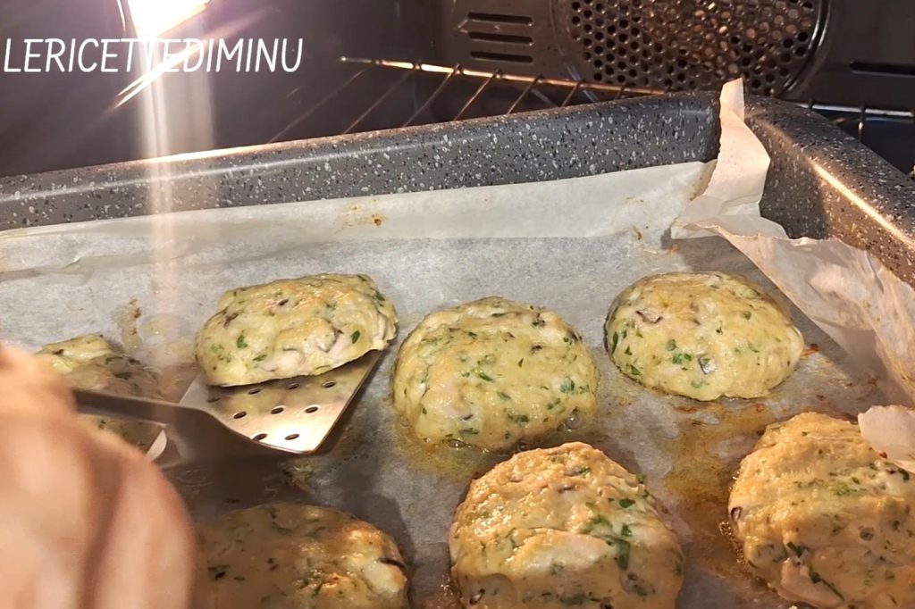 Mit angefeuchteten Händen 8 flache Bällchen formen und auf ein mit Backpapier ausgelegtes oder ein antihaftbeschichtetes Backblech legen.