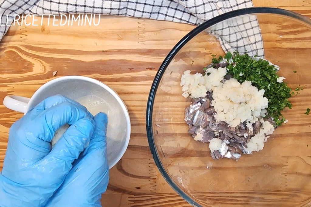 Um die gebackenen Sardellenbällchen vorzubereiten, beginnen Sie damit, die Brotkrumen von altem Brot in lauwarmem Wasser einzuweichen.