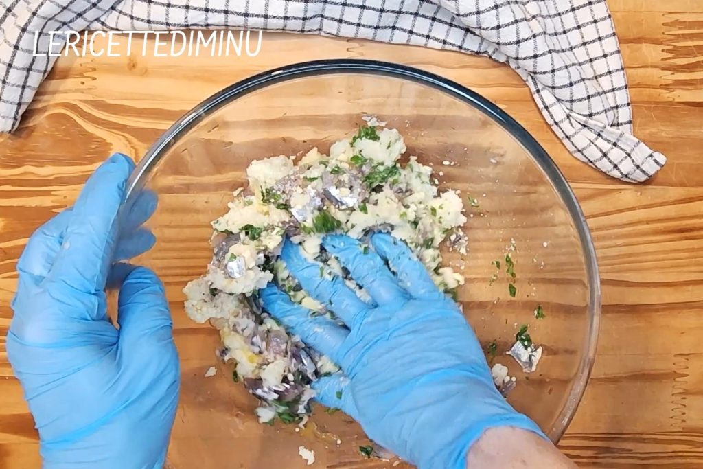 Die gut ausgedrückten und zerbröselten Brotkrumen, den frisch gemahlenen schwarzen Pfeffer, den geriebenen Parmesan oder Pecorino und ein Ei hinzufügen, dann kneten.