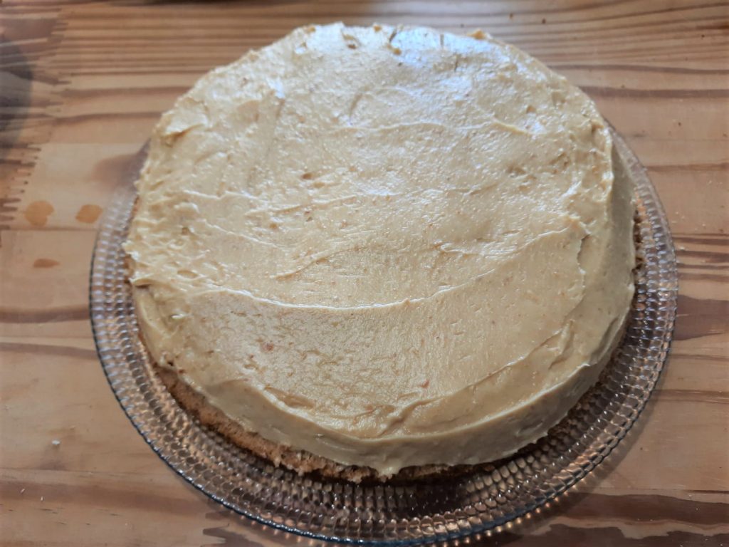 Die Creme mit einem Spachtel glattstreichen und mit der anderen Kuchenscheibe bedecken, auch diese an der Oberseite und in der Nähe der Ränder tränken.
