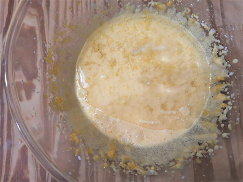 Sobald eine homogene Mischung erreicht ist, die geriebene Schale einer unbehandelten Zitrone und das Öl hinzufügen, immer mit dem elektrischen Schneebesen einarbeiten.