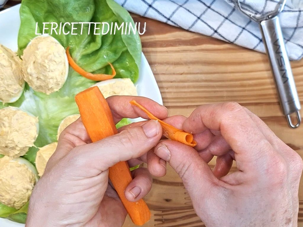 Servieren Sie die Eier, nachdem sie etwa zwei Stunden im Kühlschrank waren, und dekorieren Sie sie, wenn Sie möchten, mit Salatblättern und Karottenstreifen, die mit einem Sparschäler gefertigt wurden.
