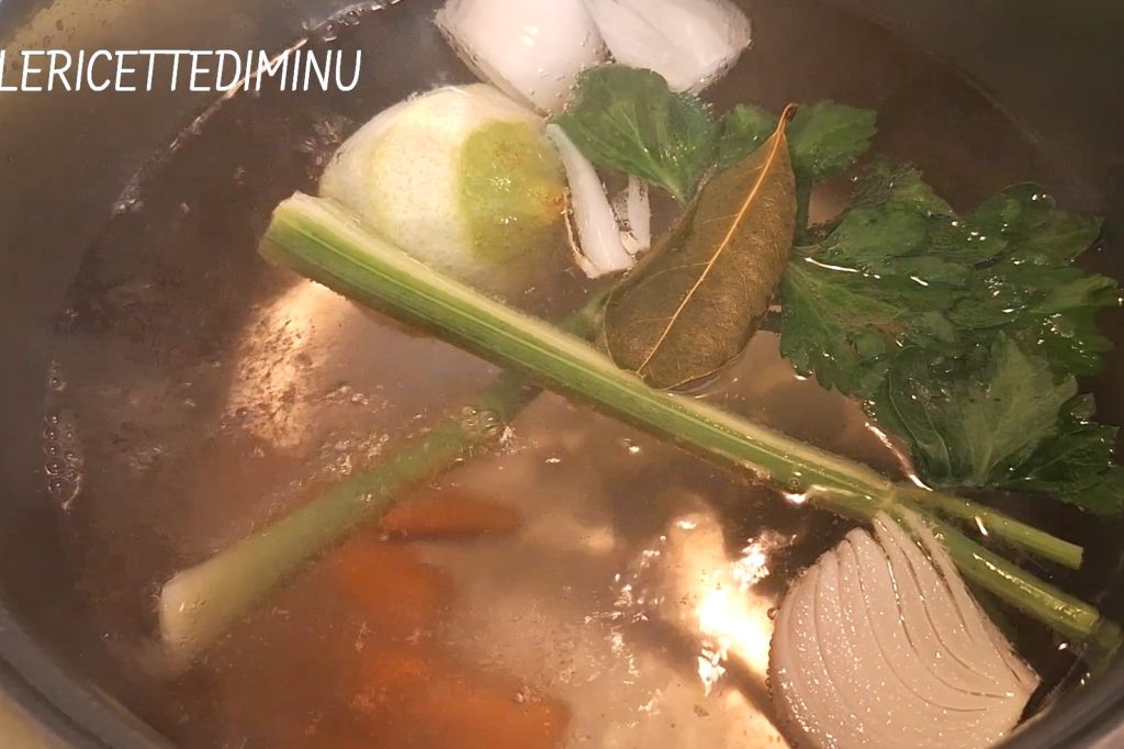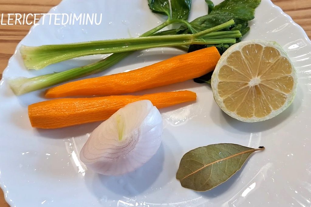 Zum Zubereiten der Hähnchenschenkel und Paprika aus dem Ofen, einen Topf mit reichlich Wasser, einer halben Zwiebel, 1 Karotte, 1 Stange Sellerie, einem Lorbeerblatt, dem Saft einer halben Zitrone und der halben Zitrone selbst auf den Herd stellen.